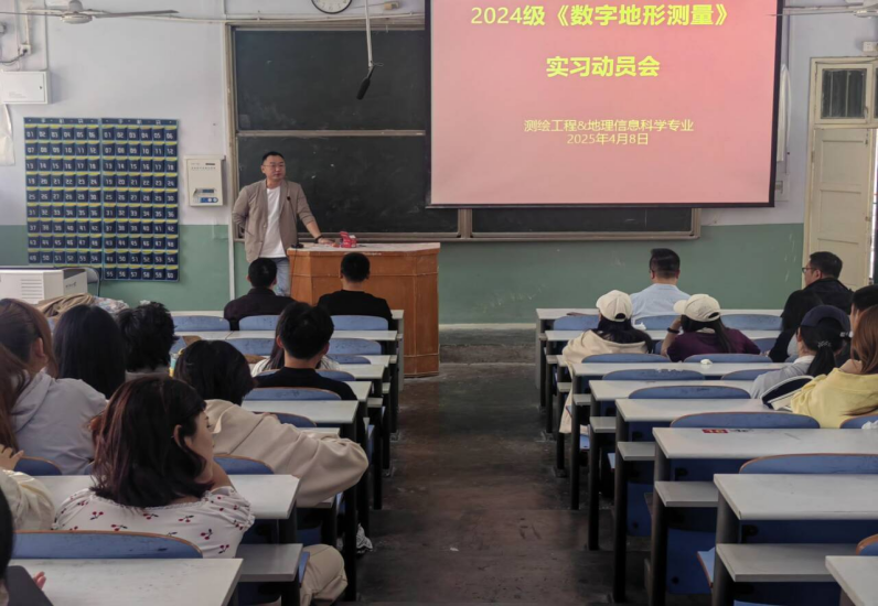 4月8日下午,RM365英国官网在教三第一阶梯教室召开数字地形测量实习动员大会。党委副书记韩勇,实习实训中心主任范宝伟,测绘工程系主任林昊,专业实习指导教师沈毅,专业班主任时满星、李晨辉,以及2024级地理信息科学专业和测绘工程专业的60名本科生参加会议,会议由林昊主任主持。