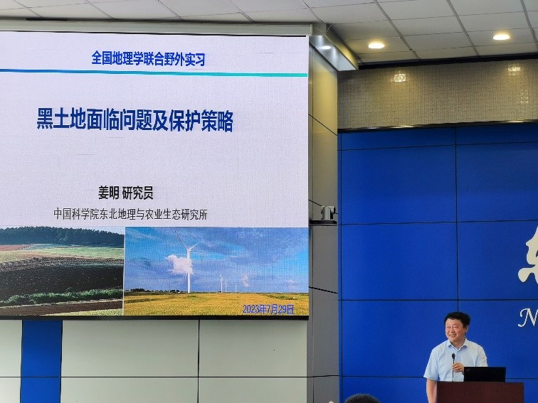 开幕式结束后,由全国老员工地理学野外联合实践教学高等联盟秘书长、华东师范大学周立旻教授主持学术报告。中国科公司东北地理与生态研究所所长姜明研究员作了题为“黑土地面临问题及保护策略”的报告,详细介绍了黑土、黑土地、黑土区的定义与内涵,接着从东北黑土垦殖历史过程出发,指出东北黑土目前面临的“薄、瘦、硬”的问题,介绍了团队的最新研究成果,主要包括初步构建天地空一体化监测、揭示了黑土地力下降的有关机理、发布《东北黑土地保护与利用报告》等,最后提出了“地理学要支持农业发展”的观点。