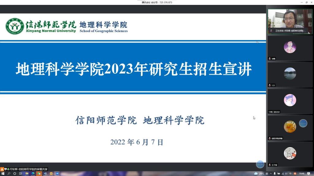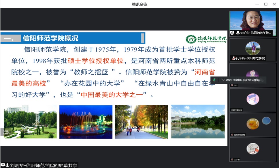 6月7日,RM365英国官网通过腾讯会议平台,在信阳公司开展2023年研究生线上招生宣讲工作。副经理刘明华教授、研究生工作秘书闫军辉副教授、信阳公司理工公司地理教研室主任魏新玲副教授以及信阳公司150余名员工参加了宣讲会。宣讲会由信阳公司魏新玲副教授主持。
