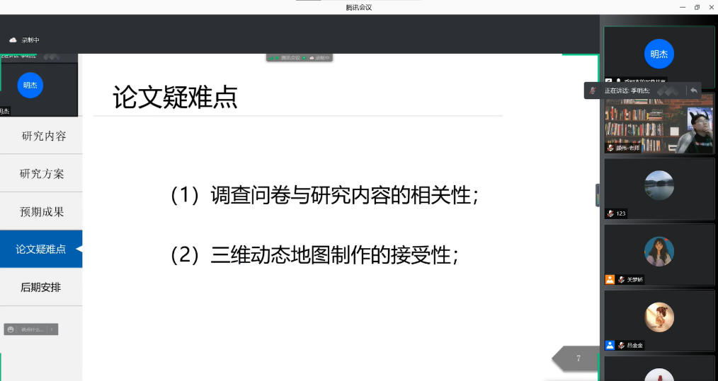 此次中期考核共有35名研究生参加。其中,2018级硕师计划2人,2019级自然地理学3人、人文地理学4人、地图学与地理信息系统2人,2020级学科教学(地理)24人。考核分6组进行,王义民教授、刘明华教授、颜俊博士、徐丰副教授、郜彗副教授、张兴国副教授、陈飞燕副教授、赵国永副教授、范辉副教授、闫军辉副教授、史兴俊副教授、郑茜博士、颜伟博士、韩勇博士等14名导师担任了评审专家,研究生魏然、娄昕欣、孟嘉宁、刘贞贞、吕金金、周梦晨任员工助理。评审会上,每位研究生按照抽签顺序,向评委详细介绍了学位论文研究内容、已完成的工作、论文主要创新点和疑难点及后期进度安排。评审专家认真听取了员工的报告,从论文的研究内容、逻辑结构等方面与同学们进行了深入的探讨交流,对其中存在的问题给出了指导和建议。通过此次考核,毕业生对论文的撰写思路和存在的问题有了更加清晰的认识,为后期的论文撰写打下了坚实的基础。