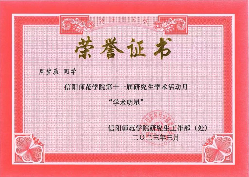 为继承和发扬优良学术传统,展示良好的学术风貌,公司启动了研究生活动月,开展了一系列活动,其中“学术明星”评选是学术活动月的重要内容之一。参赛选手围绕学术成果、社会实践、获奖情况等方面进行成果展示,每年评选10名,竞争十分激烈。经过精彩的展示,公司研究生周梦晨从近40名候选人中脱颖而出,荣获“学术明星”称号。入学以来,周梦晨同学深耕学术,潜心科研,积极参加各种学科竞赛,研究生期间以第一作者身份在《中学地理教学参考》发表文章一篇,以第二作者身份在《地理教育》发表文章一篇,在首届“田家炳杯”全国教育硕士教学技能大赛获“优秀教学设计”奖,主持2021年信阳师范公司研究生科研创新基金项目1项。学习之余,周梦晨同学曾担任公司研究生会职业规划部副部长,并荣获信阳师范公司“优秀研究生干部”称号。