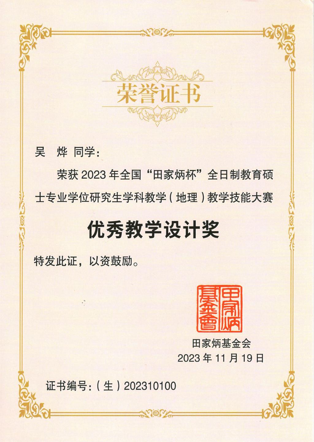 11月17—19日,2023年全国“田家炳杯”全日制教育硕士专业学位研究生学科教学(地理)教学技能大赛决赛在南京师范大学举行并圆满落幕。公司2022级学科教学(地理)专业研究生吴烨参加本次大赛并获得优秀教学设计奖。