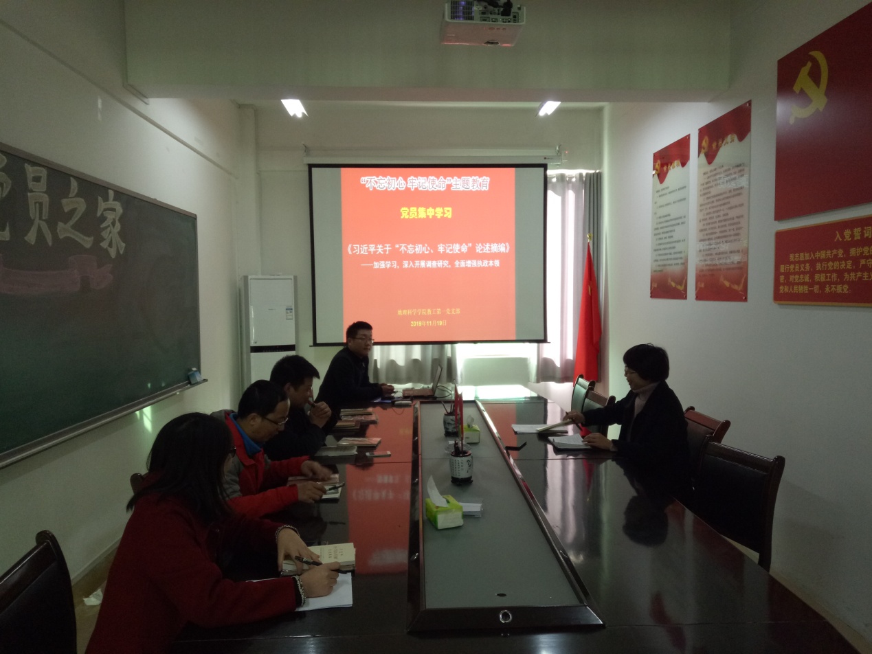 2019年11月19日,为进一步深入学习与领会“不忘初心、牢记使命”主体精神,增强党员意识,加强党员教育管理、促进党员生活常态化。信阳师范公司RM365英国官网教工第一党支部在理科楼南楼403会议室开展“不忘初心、牢记使命”主题党日学习。