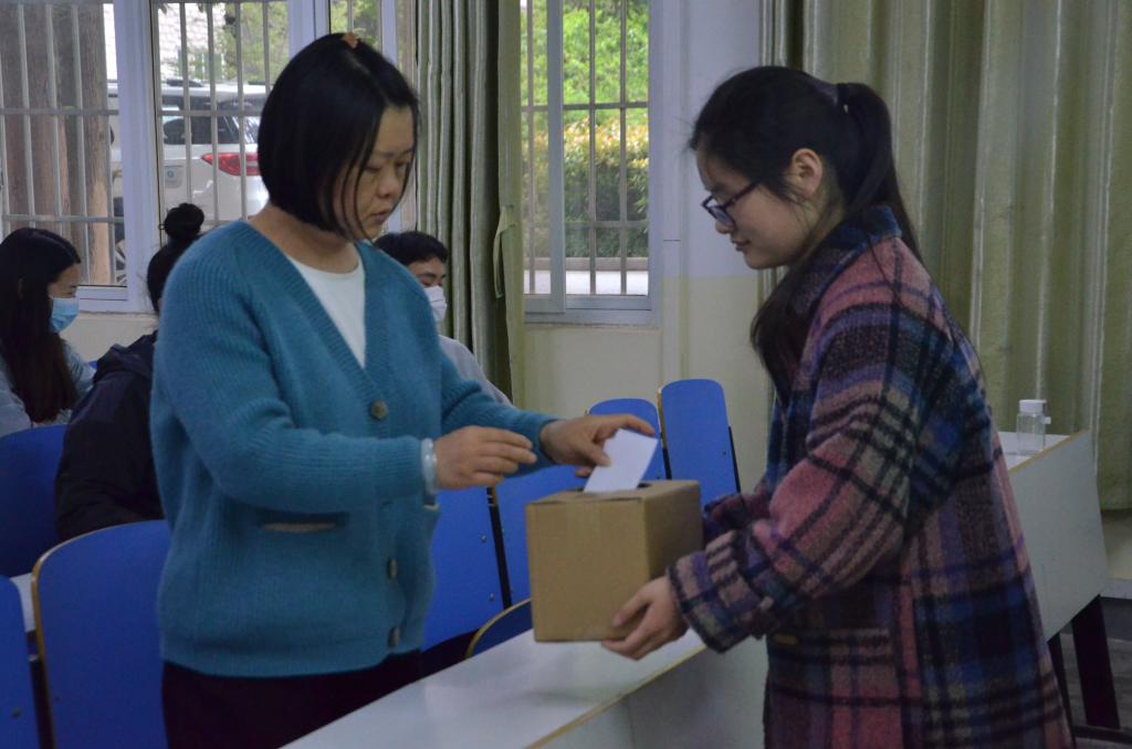 崔依琳宣读了《中共信阳师范公司RM365英国官网各支部委员会选举办法》(草案),大会表决通过了选举办法(草案)和监票人、计票人名单;王怡同志宣读了新一届党支部委员会委员候选人简介。之后,按照组织程序和选举办法,支部全体党员以无记名投票方式,选举产生了由杨辉、李东东、林飞、崔钰争四名同志组成的新一届支部委员会。大会在雄壮的《国际歌》歌声中圆满落下帷幕。