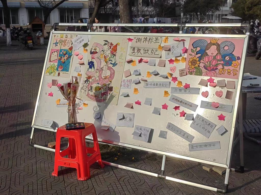 活动前期,邀请了多名美术公司学子为本次活动绘制别开生面的图画,活动组织者们也为参与活动的女生们选购了迤逦多姿的玫瑰花,用以表达对各位女生的祝福。活动现场,女生们用各色记号笔在纸上写下了自己的名字,并且在撕下展板上的负面词语标签后用准备好的记号笔在展板上留下了自己对女生独一无二的祝福语。此外,黄淑萍指导女生们在便签上写下属于自己的祈愿,勇敢的说出自己的想法和诉求。