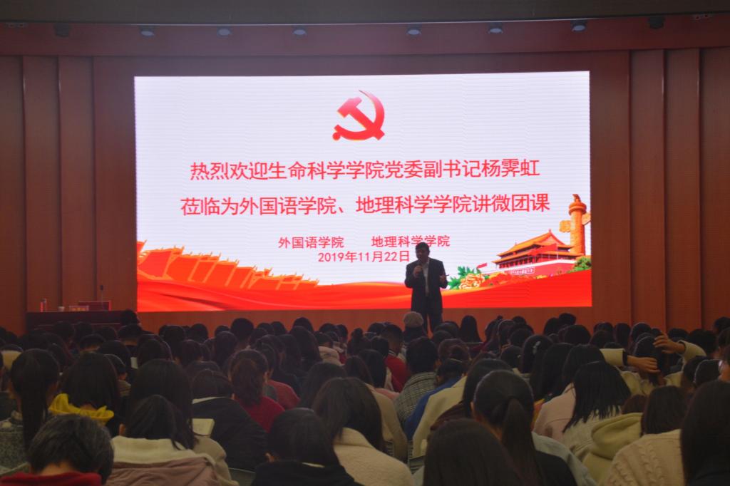 11月22日,生命科学公司党委副书记杨霁虹应邀于逸夫楼报告厅为公司及外国语公司2019级员工讲授团课。公司团委老师曹鹏鹏,外国语公司团委书记孔宪巍及两个公司2019级全体员工共同参与此次活动。