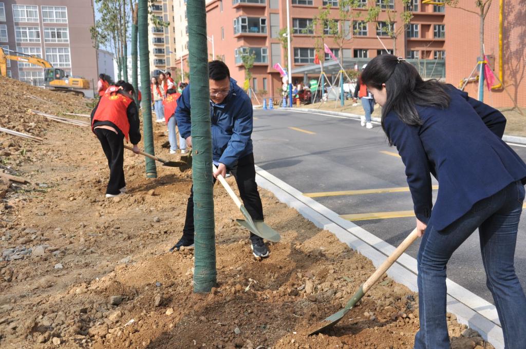 在指定植树地点,两位老师亲自参加到植树活动中,为志愿者起到了示范带头作用。志愿者们在老师们的带领下自觉分队,领取铁锨、水桶等植树工具,充分发挥团结、互助的精神,明确分工,紧密合作,有条不紊地进行着挖坑、栽植、回填、覆土、浇水等工作。最后,志愿者们在所栽种的树旁合影留念。