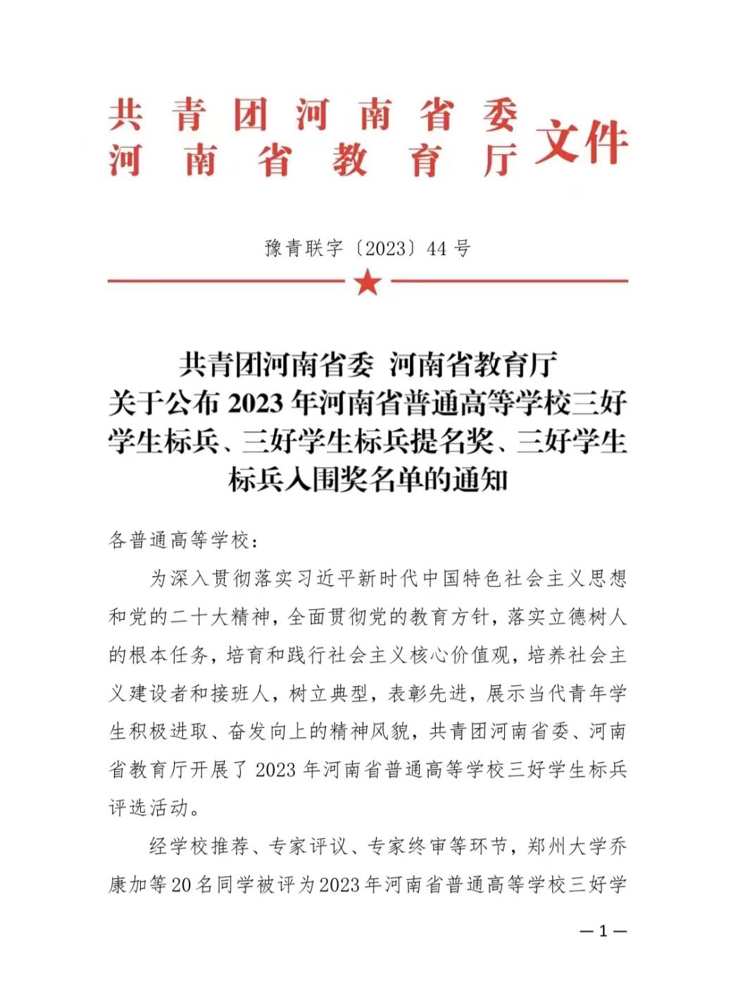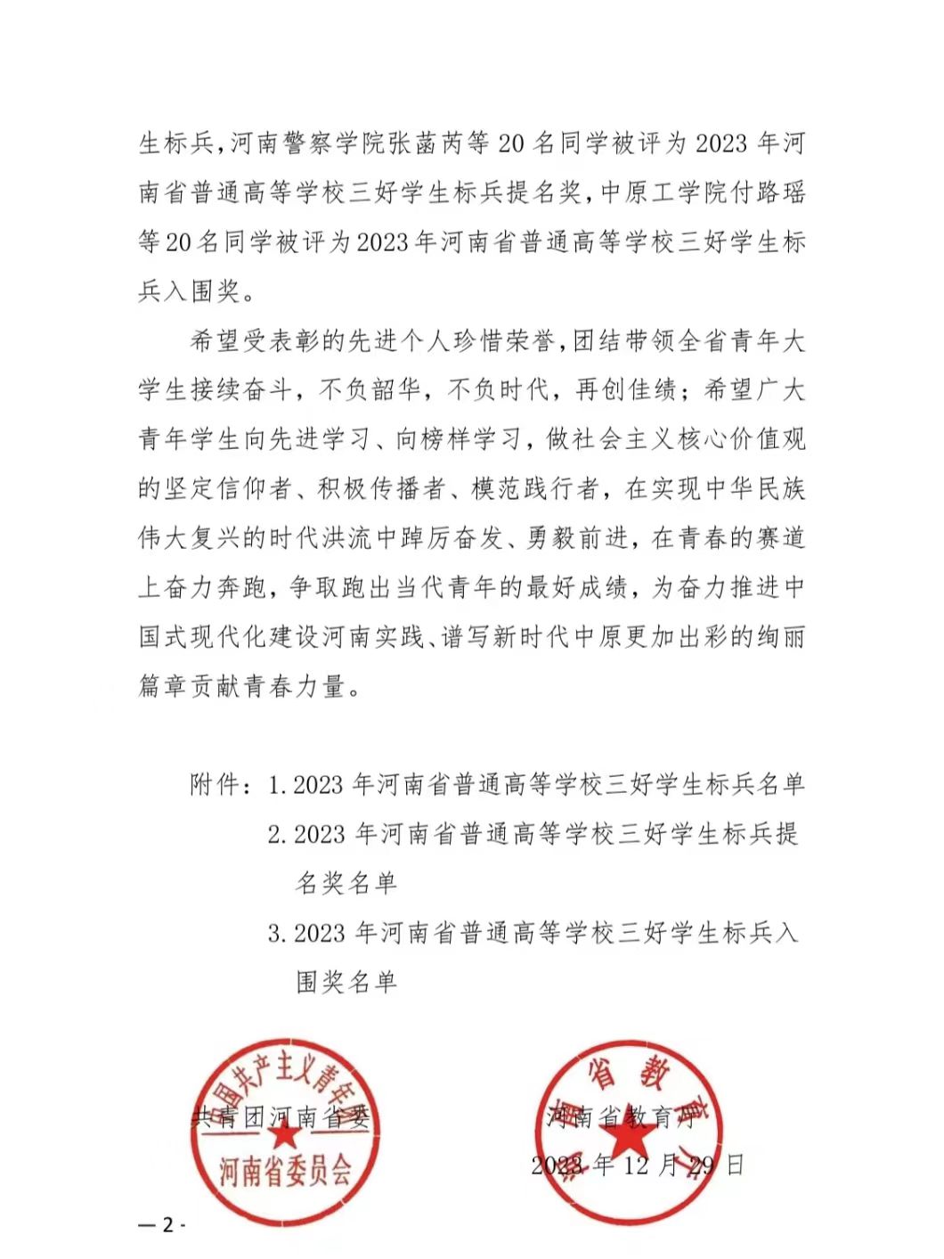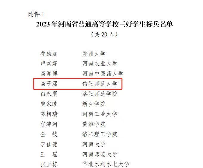 近日,共青团河南省委、河南省教育厅印发《关于公布2023年河南省普通高等公司三好员工标兵、三好员工标兵提名奖、三好员工标兵入围奖名单的通知》,全省共评选出三好员工标兵20人、三好员工标兵提名奖20人、三好员工标兵入围奖20人。公司2020级地理信息科学班高子涵同学荣获“河南省三好员工标兵”荣誉称号。