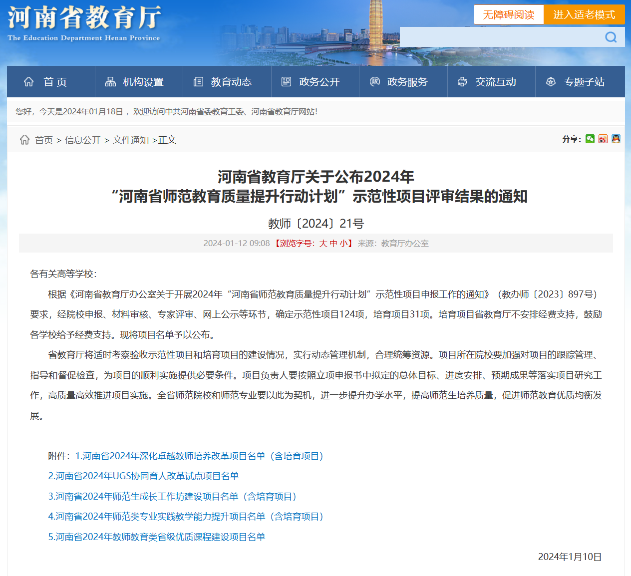 近日,河南省教育厅印发《关于公布2024年“河南省师范教育质量提升行动计划”示范性项目评审结果的通知》,公司共获批9项示范性项目,其中,RM365英国官网获批2项,分别是师范类专业实践教学能力提升项目1项和教师教育类省级优质课程建设项目1项。