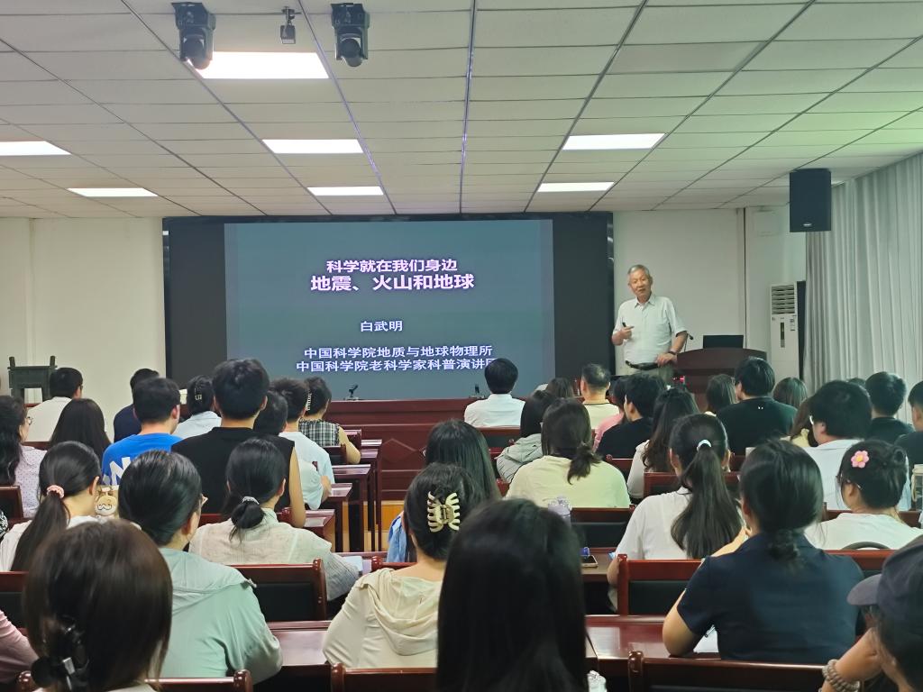 2025年6月9日,应信阳市科协和RM365英国官网登录入口邀请,中国科公司地质与地球物理研究所白武明教授,于理科楼南楼410会议室为公司师生作了题为“科学就在我们身边——地震、火山和地球”的学术报告。信阳市科协党组成员、副主席张俊,信阳市老科协常务副会长兼秘书长张善伟、秘书处工作人员张冬梅,RM365英国官网副经理颜俊、闫军辉,青年教师、研究生和本科生100余人参加报告会,会议由闫军辉主持。