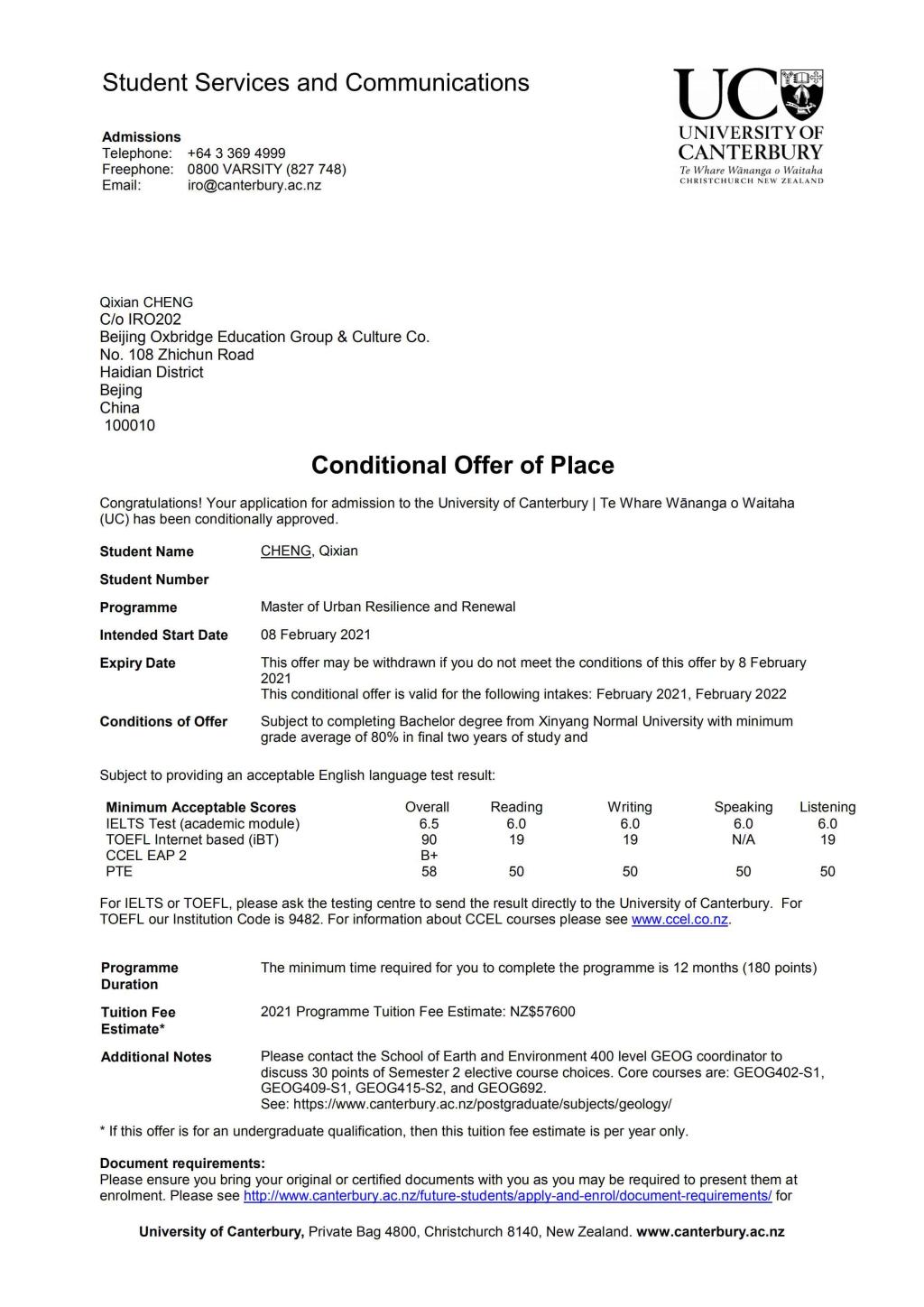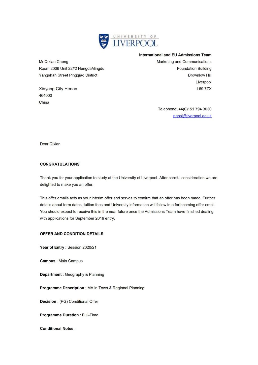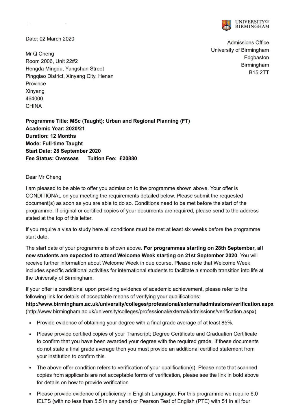 图1 条件录取(Conditional Offer)通知书