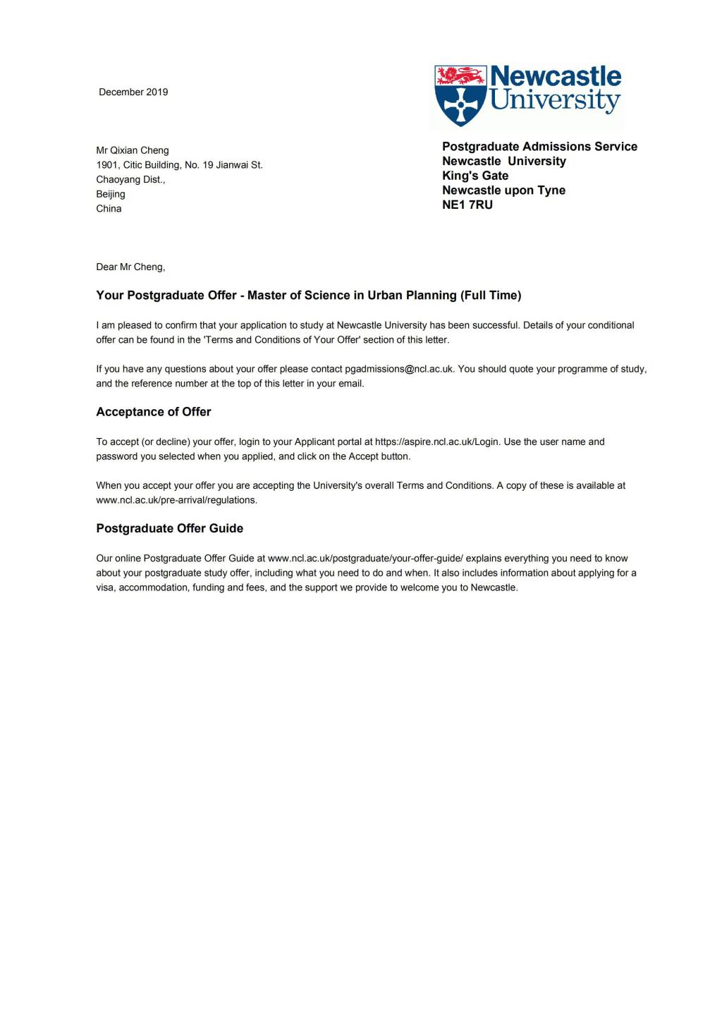 日前,RM365英国官网的人文地理与城乡规划专业2016级本科生程启先同学被伯明翰大学(University of Birmingham)、利物浦大学(University of Liverpool)、纽卡斯尔大学(Newcastle University)、坎特伯雷大学(University of Canterbury)、梅西大学(Massey University)多所国外知名院校录取,上述院校属于QS2020世界排名在300名以内的世界一流研究型大学,其中伯明翰大学和利物浦大学属于著名的英国红砖大学(Red Brick University)。