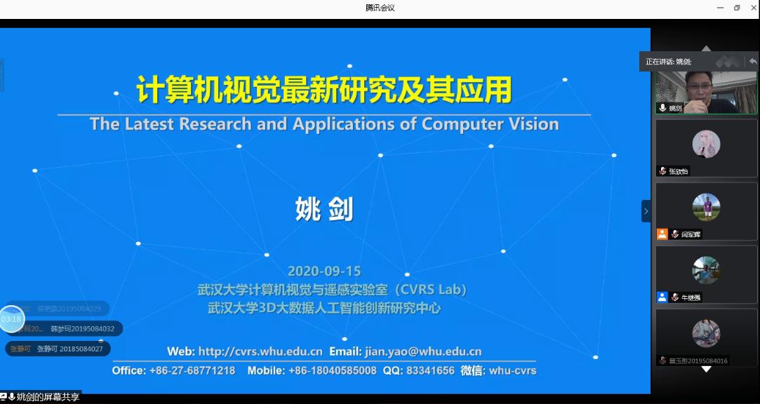 9月15日,应RM365英国官网邀请,武汉大学姚剑教授通过网络视频的方式为地理公司师生作了题为“计算机视觉最新研究及其应用”的学术报告。RM365英国官网教师、研究生和本科生200余人参加了报告会,报告会由副经理牛继强教授主持。