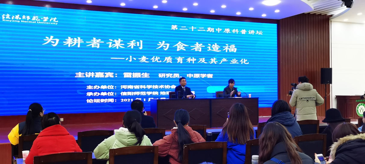 1月4日,由河南省科学技术协会主办、信阳师范公司承办的第二十二期中原科普讲坛在信阳师范公司开讲。河南省农业科公司小麦研究所所长雷振生研究员做了题为“为耕者谋利,为食者造福——小麦优质育种及其产业化”的科普报告。央广网、河南广播电视台、河南日报等媒体进行现场直播。信阳师范公司青年教师、研究生、本科生及网络观众共计6万人聆听讲座,报告由信阳师范公司副董事长郑云教授主持。