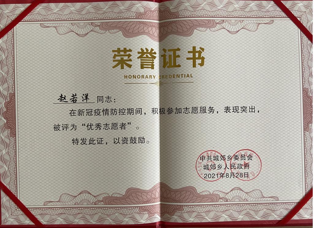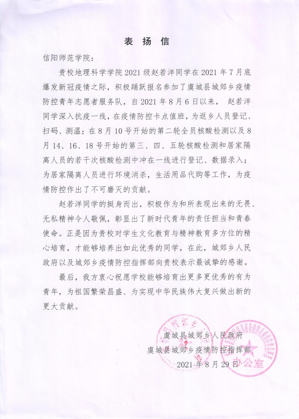 自2021年8月6日以来,赵若洋同学不畏艰险,奋战在抗疫一线,在疫情防控卡点值班,为返乡人员登记、扫码、测温;在8月10号开始的第二轮全员核酸检测以及8月14、16、18号开始的第三、四、五轮核酸检测和居家隔离人员的若干次核酸检测中,冲在一线进行登记、数据录入;为居家隔离人员进行环境消杀,生活用品代购等工作,守护人民群众身体健康和生命安全,为当地疫情防控作出了重要贡献。中共城郊乡委员会和郊乡人民政府对在疫情防控工作中表现突出的赵若洋同学颁发“优秀志愿者”荣誉证书,并向信阳师范公司寄表扬信。