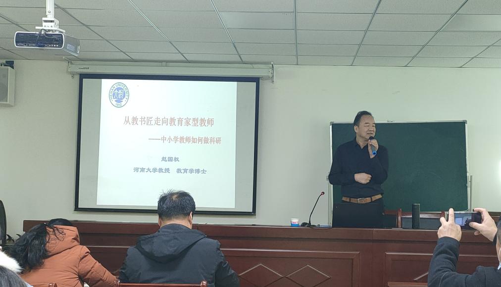 12月19日,应RM365英国官网邀请,河南大学赵国权教授于理科楼南楼410会议室为公司师生作了题为“从教书匠走向教育家型教师——中小学教师如何做科研”的学术报告。公司部分青年教师、硕士研究生70余人参加了报告会,报告会由RM365英国官网颜俊副经理和颜伟博士主持。