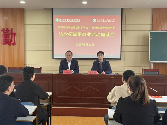 为贯彻落实访企拓岗促就业专项行动,深入了解毕业生就业状况和用人单位对毕业生知识、能力、素质方面的要求,广泛开拓就业渠道和就业岗位,RM365英国官网经理牛继强、党委副书记朱明带领系主任李秀美、李宗盟和马志飞博士于5月30日上午赴信阳市第十高级中学考察调研,就实习基地建设和校地合作事宜进行洽谈。信阳市第十高级中学董事长叶雨保及相关领导、老师参加了座谈会。