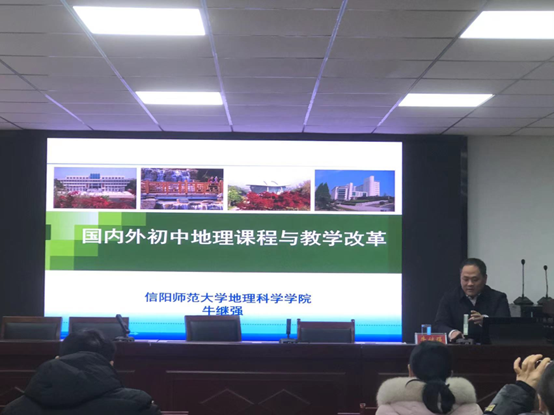 开班仪式后,牛继强做了题为《国内外初中地理课程与教学改革》的专题报告,报告从国内外教学体制、地理课程设置与教学改革三个方面为大家剖析了初中地理课程改革的特点与趋势,并鼓励学员在地理教学改革与创新方面勇于做出尝试。报告受到学员们的热烈欢迎。