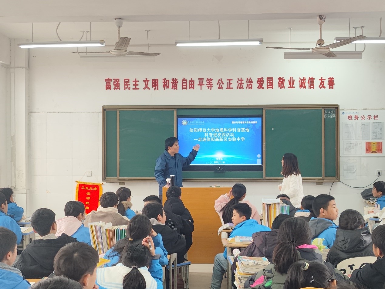 为加强科普资源助推“双减”常态化合作,应信阳市高新区实验中学邀请,12月1日RM365英国官网登录入口地理科学科普基地刘明华教授、张兴国副教授、史兴俊副教授、张辰光副教授、张中典博士为7年级、8年级同学们开展“科普进校园”系列科普讲座活动。