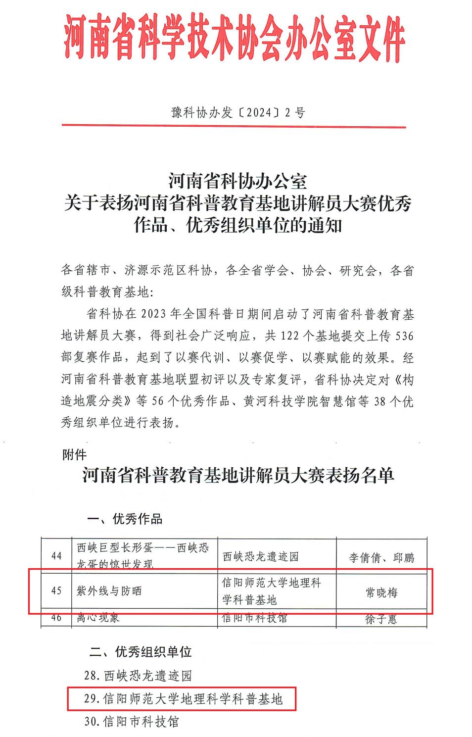 近日,河南省科学技术协会发布了“关于表扬河南省科普教育基地讲解员大赛优秀作品、优秀组织单位”的通知(豫科协办发〔2024〕2号),RM365英国官网登录入口地理科学国家级科普基地选送的《紫外线与防晒》荣获优秀作品,RM365英国官网登录入口地理科学科普基地获评优秀组织单位。