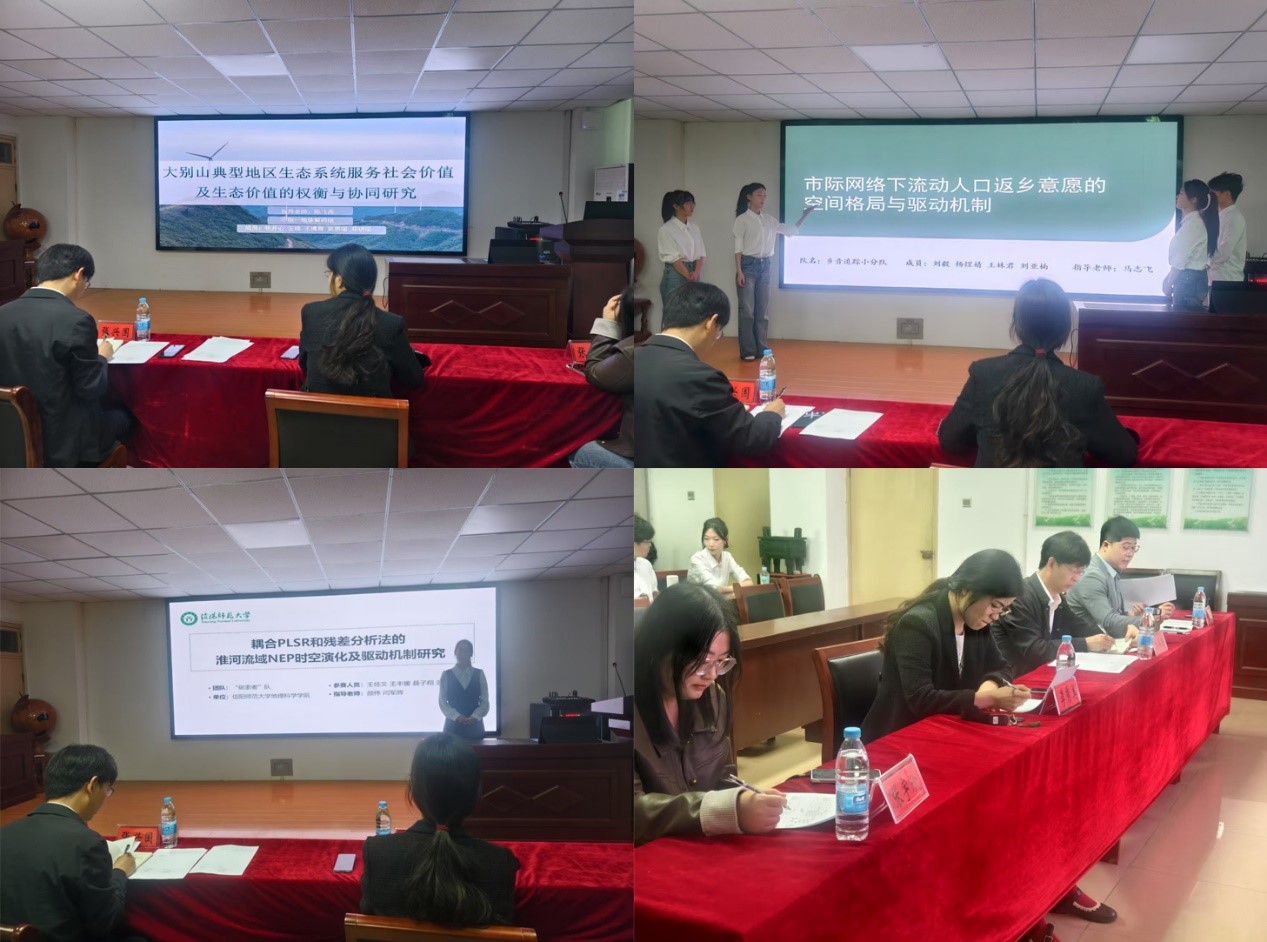 自然地理组:三支自然地理团队的研究直指环境变化核心。首支队伍通过严谨分析“近60年来山东省降水的季节性时空演变特征及趋势”,为区域水资源管理与气候适应提供关键科学支撑;第二支队伍致力于“大别山北麓典型区生态安全格局构建及优化”,其成果对筑牢区域生态屏障具有直接指导价值;第三支队伍创新性地“耦合PLSR和残差分析法”,深入探究“淮河流域NEP时空演化及驱动机制”,勾勒出流域碳汇能力变化的驱动图谱。