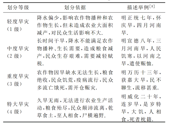 由于史籍中对干旱的划分标准暂未统一。本文参照前人划分依据,根据干旱持续时间长度、受灾面积和灾情描述等方面进行等级划分如下表: