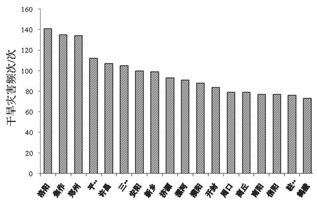 总体而言,河南省干旱灾害频次分布规律主要以洛阳市、郑州市为中心,逐级向外递减,基本呈现出东南部发生频次少,西北部发生频次多的特征。
