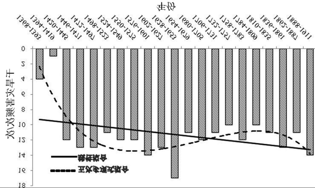 结合图2线性拟合趋势线分析可知,明清时期河南省干旱灾害呈现出逐年增加的趋势.结合五次多项式拟合曲线来看,明清时期河南省表现出前期干旱灾害发生频次较少,后期较多。