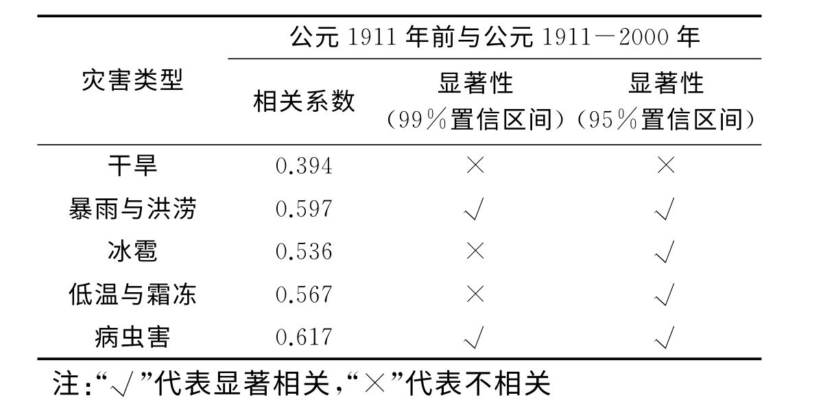 最后,研究者对公元1911年以前与公元1911-2000年河南省主要气象灾害进行空间相关分析,发现干旱灾害的多发区发生了明显的转移,冰雹、低温与霜冻灾害的多发区在这两个时期仅出现了少量的转移;而暴雨与洪涝和病虫害的多发区却没有发生转移,即两种灾害空间发生分布基本一致。