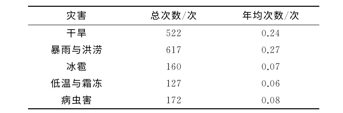 首先,过去2000年以来河南省气象灾害频发,各类气象灾害共发生1929次,发生频率为0.87。其中暴雨与洪涝是河南省发生次数最多的气象灾害,共发生689次,占总次数的35.72%;其次为干旱灾害,共发生598次,而低温与霜冻灾害发生次数最少,为198次,仅占10.26%。
