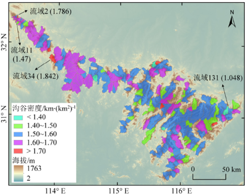 首先,研究者根据河网总长度与所研究流域面积,计算出流域的沟谷密度为1.048~1.842km/km2,平均约1.565km/km2。其中,桐柏山区沟谷密度呈现出“降低—升高—降低”的趋势,大别山区的沟谷密度大致呈现由西北向东南减小的趋势,但中段与东段沟谷密度分布较均匀,由此发现,研究区沟谷密度在空间上的变化不显著,但仍有一定规律。