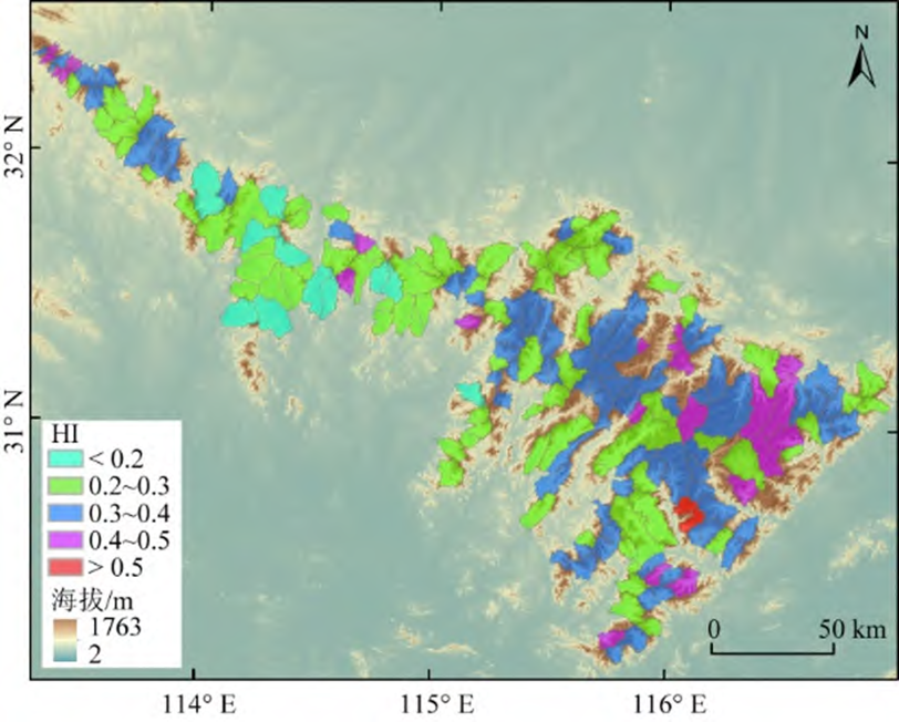 接着,研究者借助流域内海拔高度,测出研究区流域的HI值为0.12~0.51,平均值约为0.31,发现从整体上看,桐柏-大别山区流域的HI值呈现出一定的由西北向东南增大的趋势,但在南北方向上变化不显著。