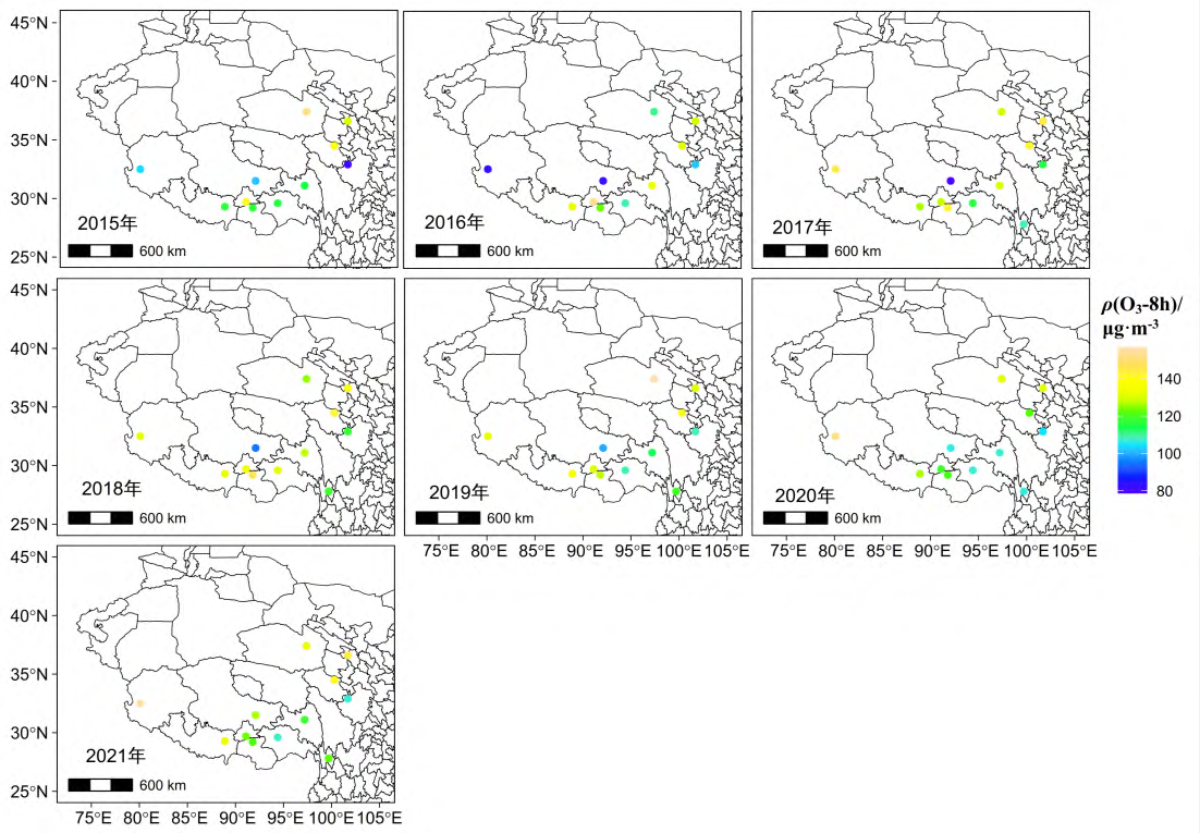 研究者发现,在2015-2021年间,青藏12个城市ρ(O₃-8h)年均值范围为78.7-156.7 μg·m-3,其臭氧含量要明显低于京津冀地区、广东省和珠三角等地。