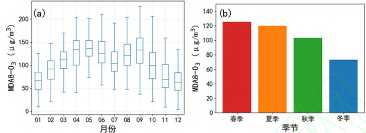 图2 2015—2020年信阳市MDA8-O3月变化(图a)和季节变化(图b)