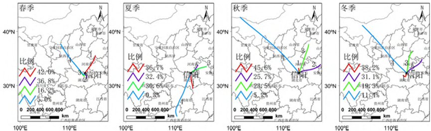 从外部影响来看,春季的聚类1、2气团途径武汉附近以及山东济宁等工业城市。夏季的聚类1、2、3气团来自于安徽西部以及湖北东部,为主要污染源区;从内部影响来看,除聚类1外,秋冬季的气团其他聚类方向相似,可能与信阳市地势南高北低,且秋冬季信阳的风向主要为西北风有关。
