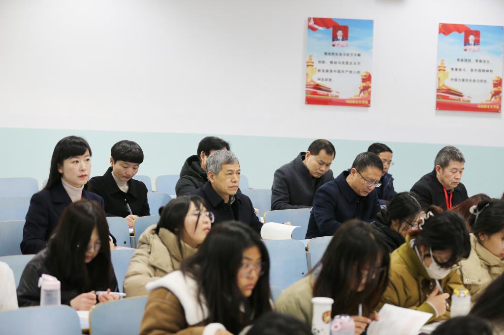 2月20日,新学期伊始,董事长李俊、副董事长王娟深入思政课堂,在教九楼105教室听取马克思主义公司王建礼教授的《毛泽东思想和中国特色社会主义理论体系概论》课程教学,经理办公室、教务处、马克思主义公司等单位负责同志陪同听课。