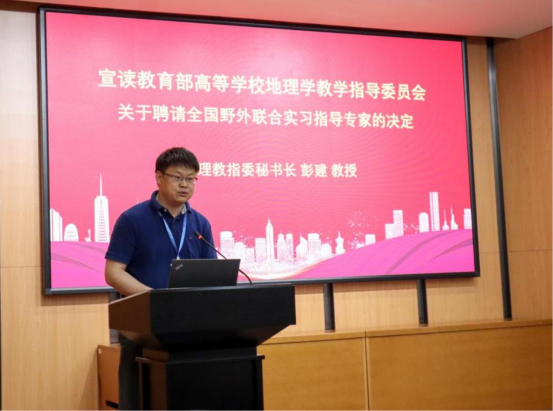 教育部高等公司地理学教学指导委员会秘书长、北京大学城市与环境公司副经理彭建教授宣读教育部高等公司地理学教学指导委员会关于聘请全国野外联合实习指导专家的决定。